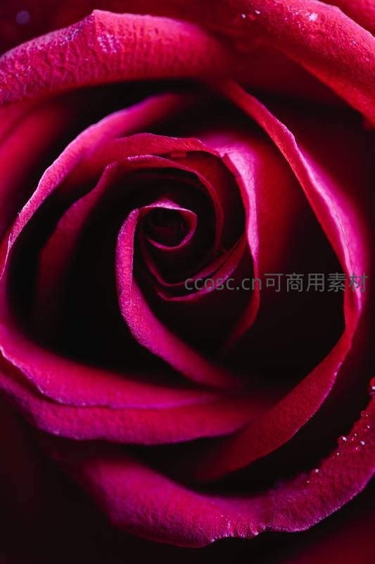 镜头深入玫瑰花心,深红色的花瓣层层叠叠,边缘点缀着晶莹水珠,在暗调背景下更显质感与神秘,仿佛能嗅到浓郁芬芳。
