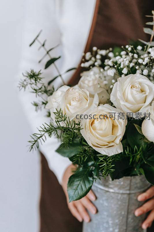 一位花艺师双手捧着一束由白色玫瑰、满天星和翠绿枝叶组成的精致花束,置于复古金属桶中,尽显温柔与专业。