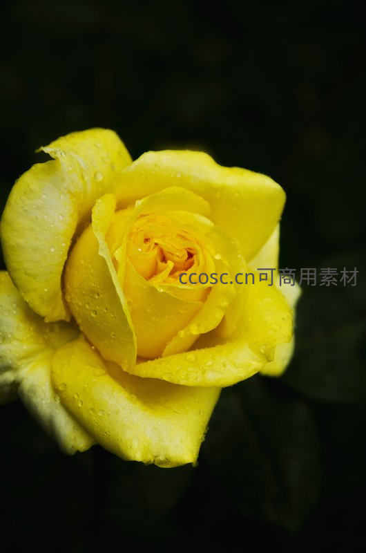 一朵鲜黄玫瑰在深色背景前熠熠生辉,晶莹水珠点缀其上,柔和光线勾勒出花瓣轮廓,尽显晨间清新的柔美与活力。