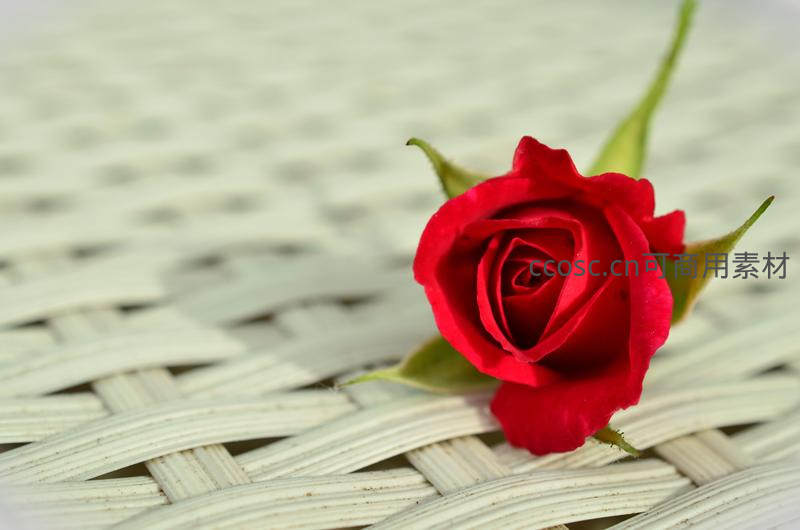 红玫瑰静卧藤编表面,简约温馨