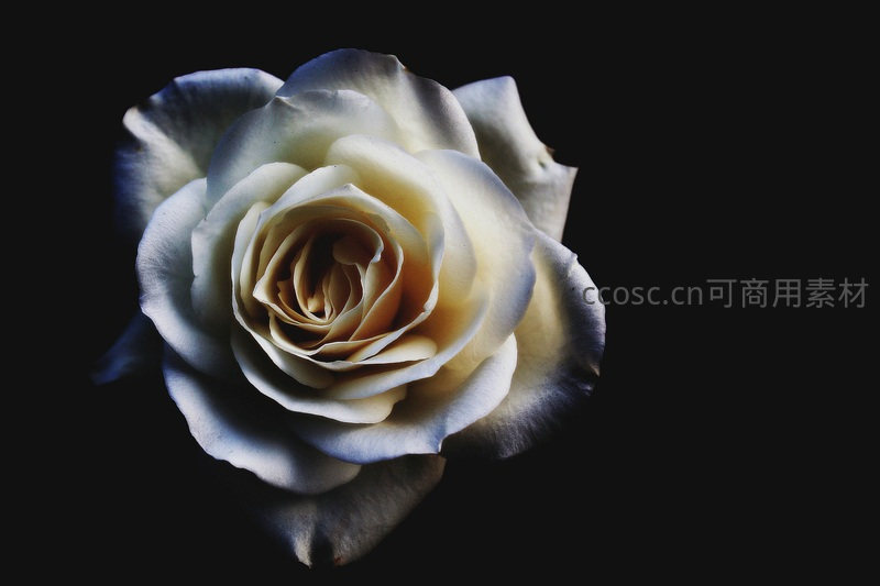 一朵洁白的玫瑰在纯黑背景下被聚光灯照亮,层层花瓣如丝绸般柔滑,营造出神秘而高雅的艺术氛围。