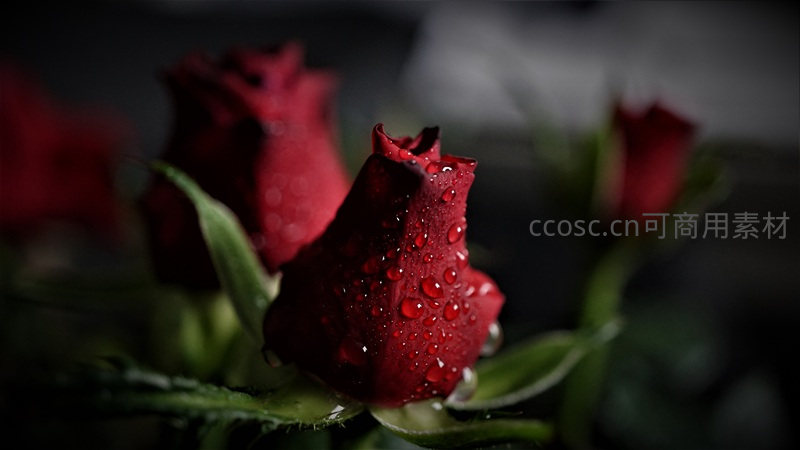 在幽暗背景下,几朵深红色玫瑰花苞上缀满晶莹水珠,强烈的明暗对比和冷色调营造出神秘而忧郁的视觉效果,充满情感张力。