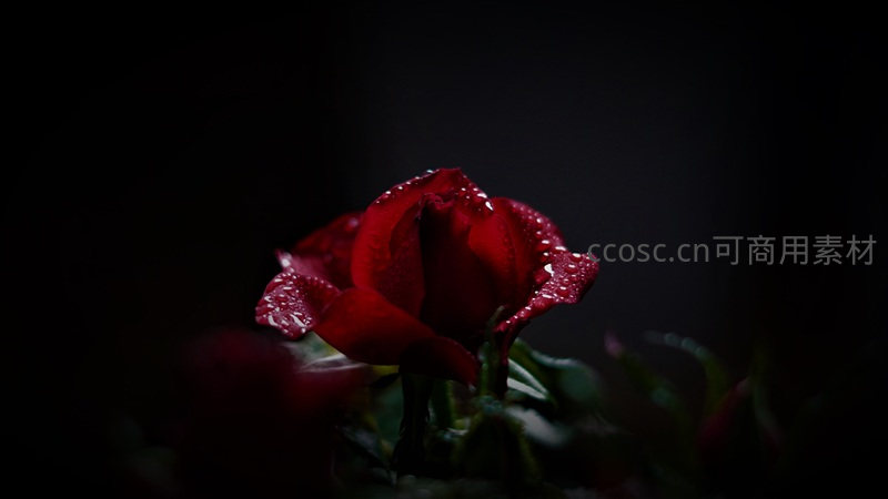 一朵深红色玫瑰在黑暗背景中绽放,晶莹水珠附着于花瓣边缘,营造出神秘而忧郁的氛围,象征着爱与伤感交织的情感。