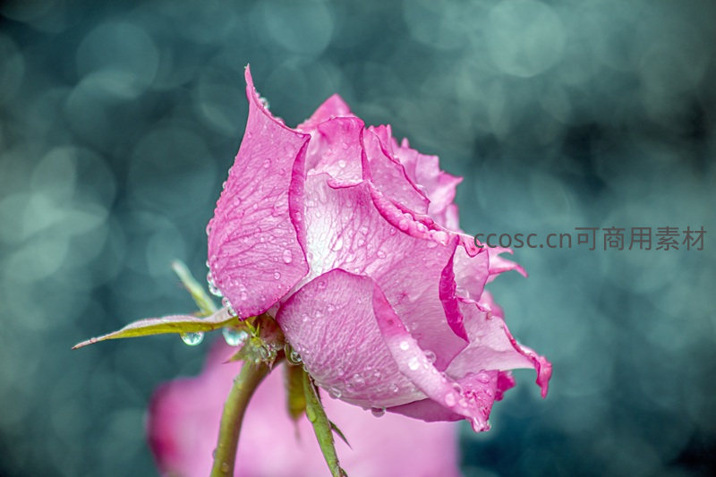 粉色玫瑰在柔和散景背景下舒展绽放,细密水珠轻缀其上,传递清晨的宁静与生命的温柔,是自然之美的细腻呈现。