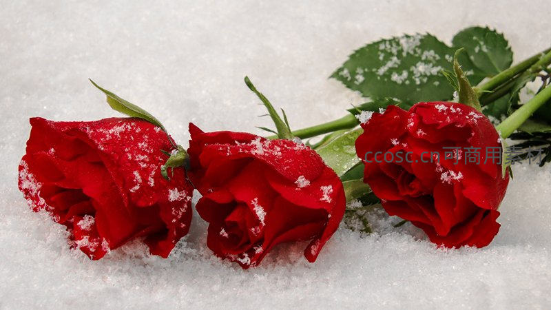 三朵艳丽红玫瑰静卧于洁白积雪之中,冰晶覆盖花瓣却不掩其灼灼光芒,展现生命在严寒中依然热烈绽放的顽强之美。