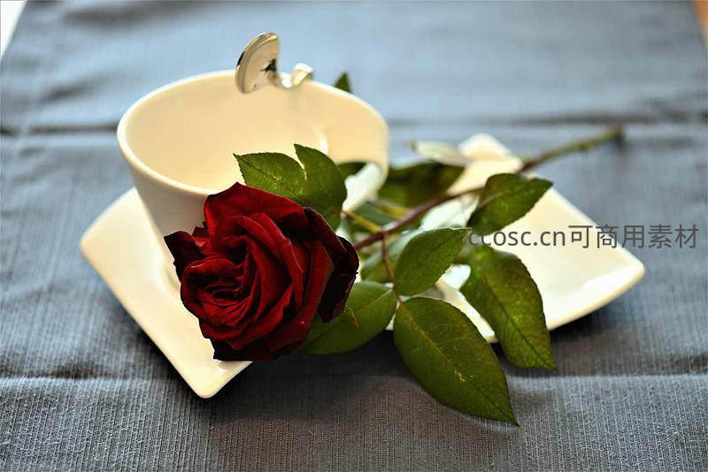 一朵深红玫瑰斜倚在白色咖啡杯旁,置于灰色桌布之上,绿叶点缀,营造出悠闲惬意、充满情调的午后时光。