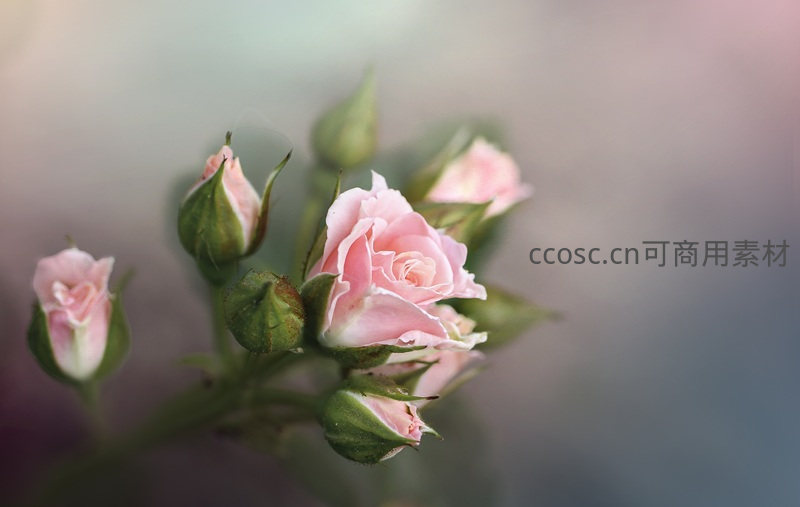 几朵粉色玫瑰花蕾在柔和模糊的背景中悄然绽放,绿色萼片包裹着娇嫩花瓣,画面弥漫着温柔、期待与新生的气息。