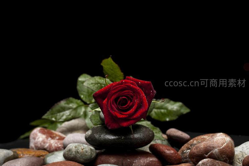 一朵鲜红的玫瑰被精心置于光滑的鹅卵石之上,纯黑背景凸显其孤傲之美,传递出宁静、沉思与纯粹的艺术感。
