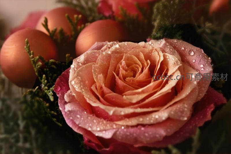 一朵盛开的粉红色玫瑰,花瓣上布满晶莹剔透的水珠,在柔和光线下显得格外娇艳欲滴,背景中隐约可见松枝与装饰球,营造温馨浪漫氛围。