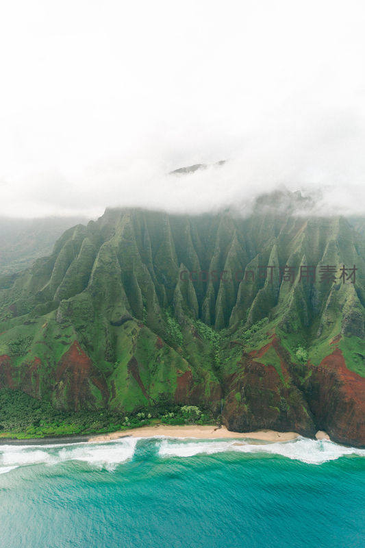 连绵起伏的绿色山峦被云雾轻柔笼罩,山脚是金色沙滩与碧蓝海水交汇,构成一幅宁静而梦幻的海滨画卷。