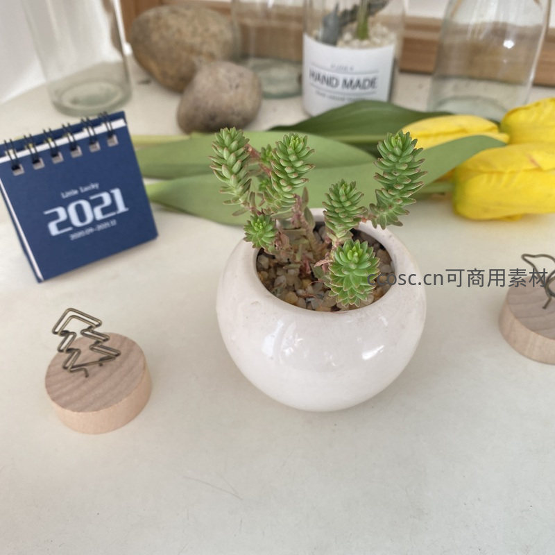 一盆翠绿的多肉植物置于简洁的白色陶瓷盆中,背景是柔和的桌面陈设,包括日历和鲜花,整体画面清新自然,充满治愈感。