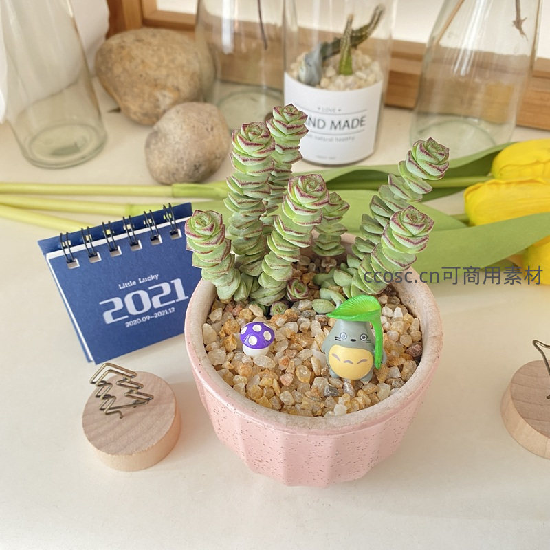 粉色花盆中的星乙女多肉与龙猫装饰