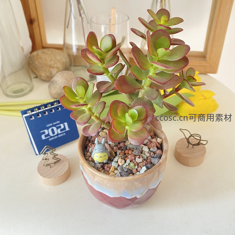叶片边缘泛红的玉树多肉在彩色陶盆中茁壮生长,盆内点缀着龙猫玩偶,周围散落鹅卵石和木质小物,构成一幅充满童趣与自然气息的桌面风景。