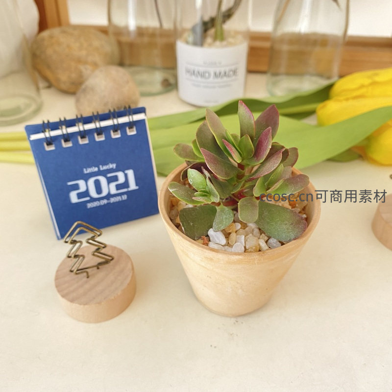 一株小巧的玉树多肉种植在素雅的陶土盆中,叶片青翠带红边,搭配白色砂石。旁边是蓝色台历和木质书签,背景模糊的玻璃瓶与石头,构成极简而温馨的办公或居家场景。