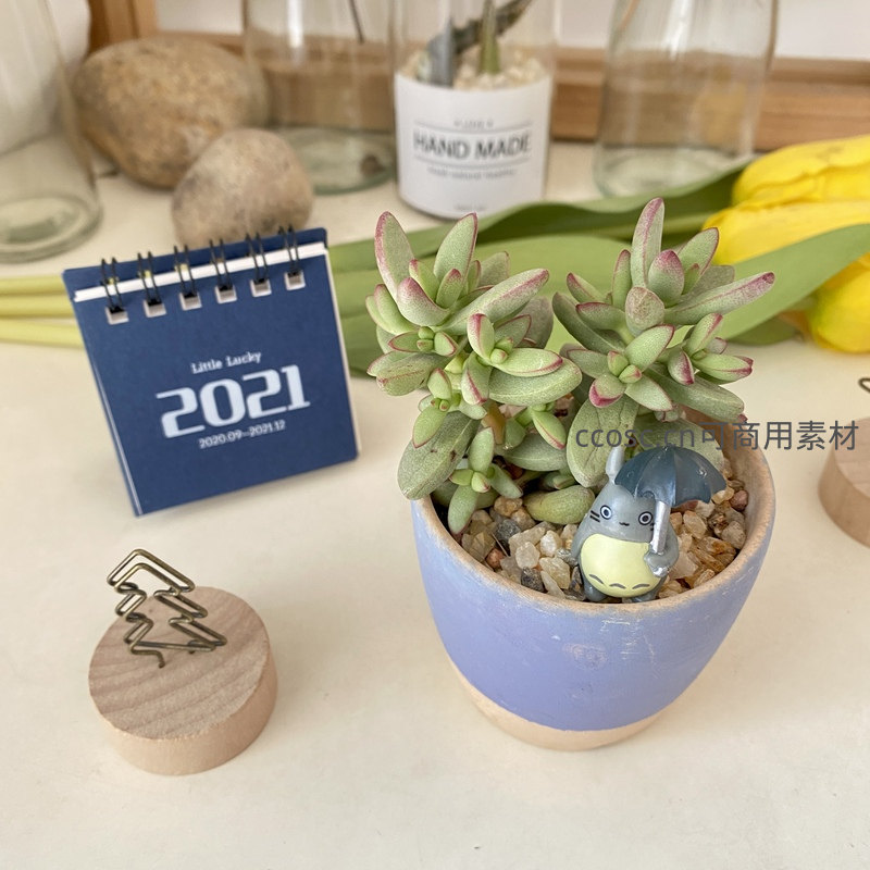 绿色多肉盆栽中放置一只撑伞的龙猫小玩偶,搭配蓝色日历与木质夹子,背景有黄花点缀,整体风格童趣温馨,适合家居装饰。