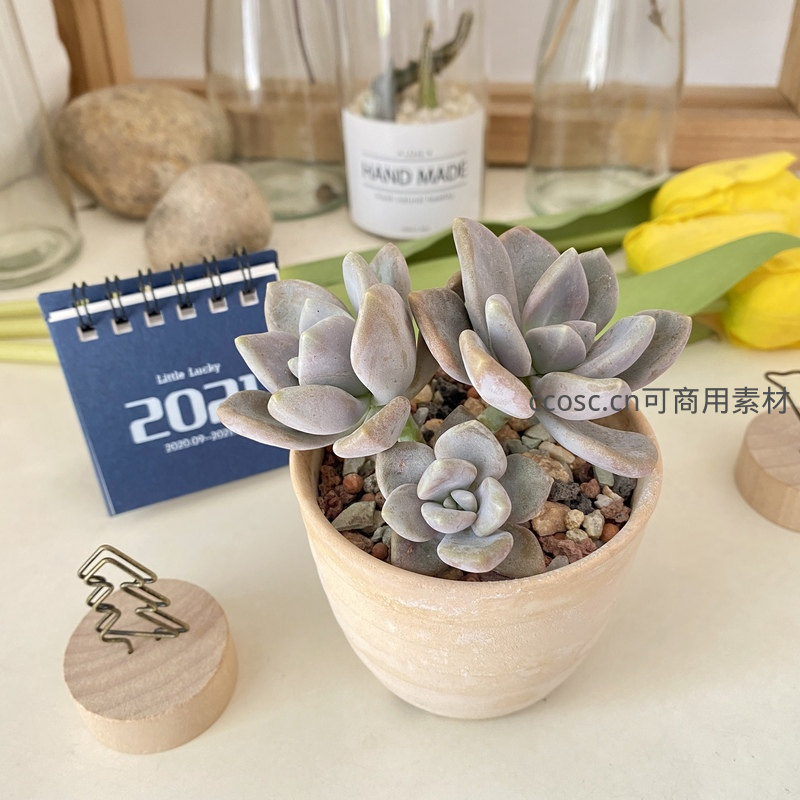 灰紫色多肉植物群生在陶盆中,叶片厚实饱满,质感细腻,背景有蓝色台历和黄色郁金香,整体画面优雅宁静,充满自然治愈力量。