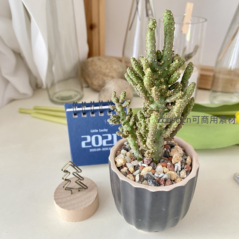 枝干挺拔的绿色仙人掌种植在几何造型的灰色花盆中,搭配彩色石子与背景日历,展现现代简约又不失生机的办公桌风景。