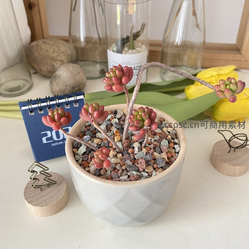 一盆拥有细长枝干和饱满红色叶片的多肉,搭配彩色石子与蓝色日历,构成充满文艺气息的桌面角落装饰场景。
