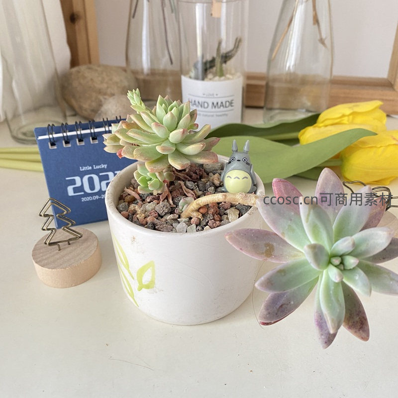 白色花盆中盛放着淡绿色多肉,配以经典龙猫玩偶,整体风格清新自然,为工作或学习空间注入一丝童趣与宁静。