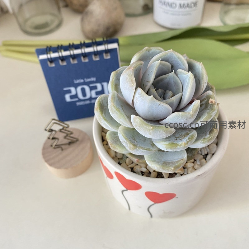 蓝灰色多肉层层叠叠如玫瑰绽放,置于绘有红色爱心的白色花盆中,简约而浪漫,为日常空间带来温柔治愈的力量。
