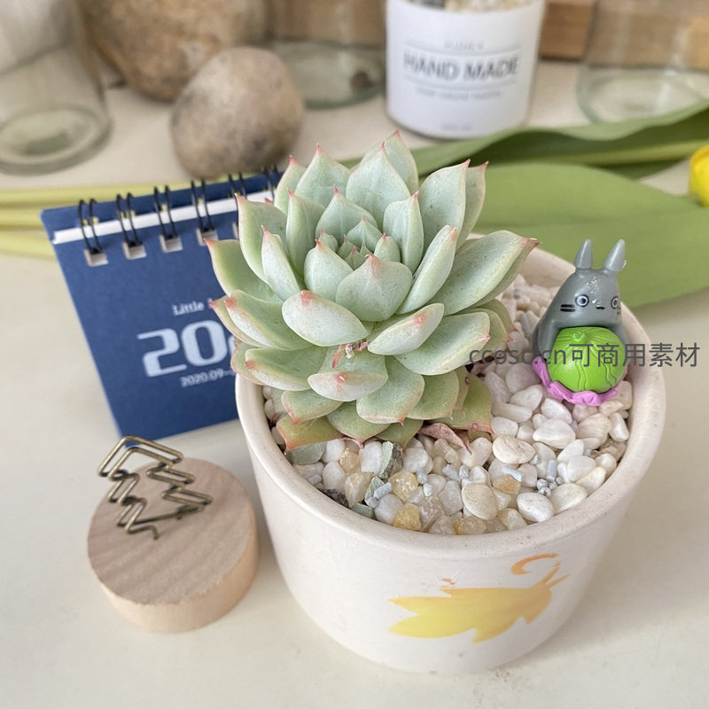 一盆淡绿色多肉植物搭配灰色龙猫小摆件,置于白色陶盆中,周围铺满白色鹅卵石,营造出温馨可爱的桌面氛围。