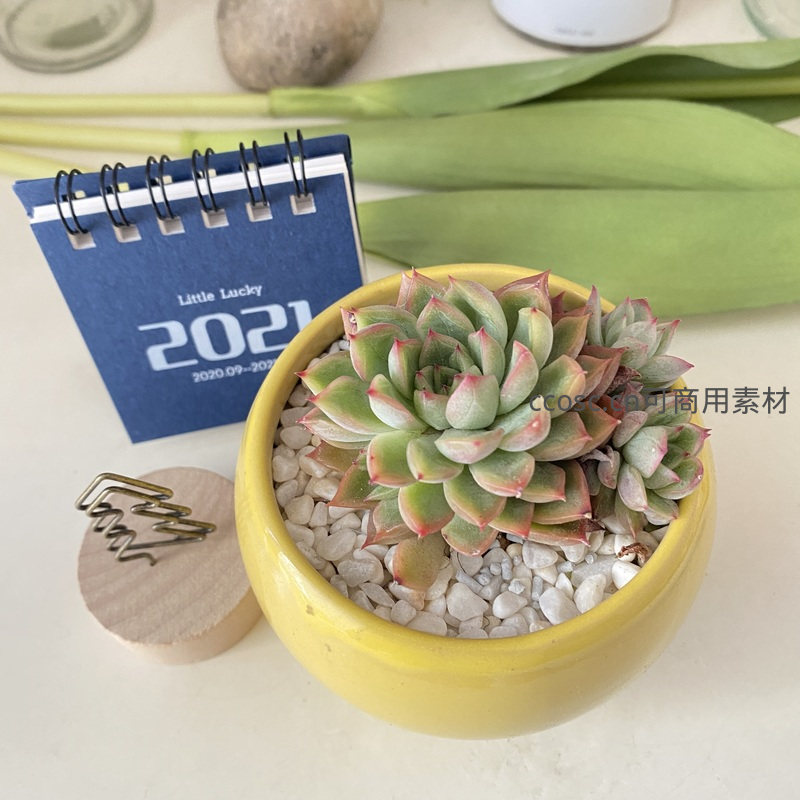 一株叶片边缘泛红的多肉植物,盛放在明亮的黄色陶瓷花盆中,配以白色鹅卵石,旁边是蓝色台历,整体画面清新可爱。