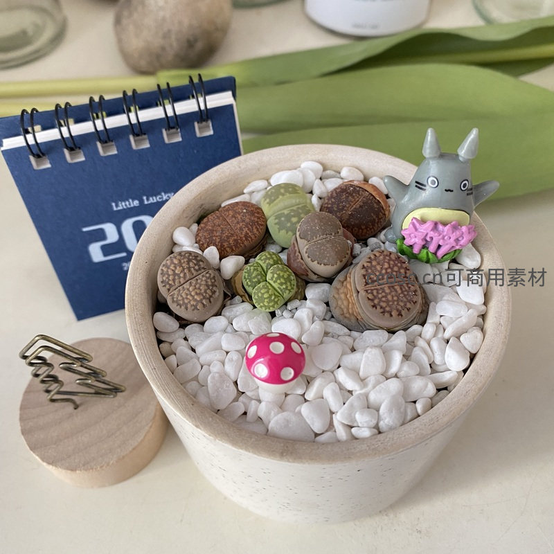 生石花盆景配龙猫与蘑菇,萌趣十足