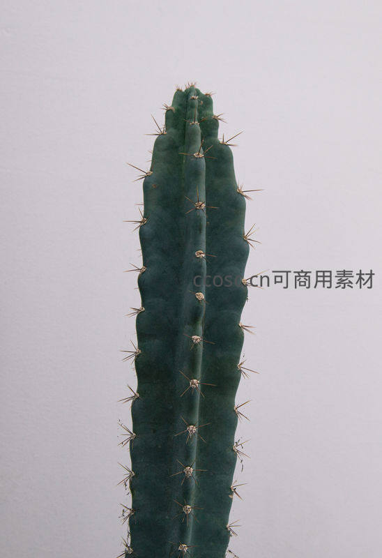 一株深绿色的柱状仙人掌在纯白背景下挺拔而立,其表面规则分布的金黄色尖刺,构成一幅极简而有力的视觉画面。