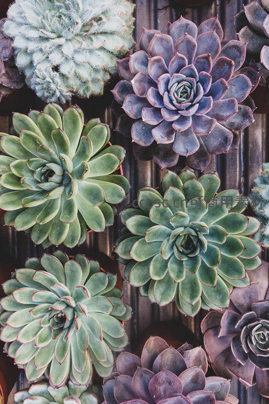 深紫、翠绿、灰蓝等各色多肉植物紧密排列,形成一幅充满视觉冲击力的自然拼贴画,展现植物的多样之美。