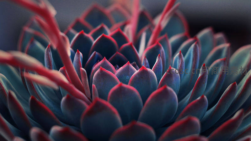 微距镜头捕捉到多肉植物中心的精致细节,深蓝紫色叶片边缘泛着鲜艳的红色,色彩对比强烈,充满视觉冲击力。