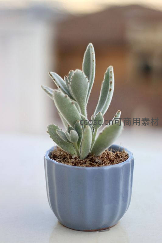 一盆毛茸茸的月兔耳多肉植物,灰绿色的叶片如同小兔子的耳朵,搭配淡蓝色的竖纹花盆,显得格外可爱,为室内增添一抹温柔。