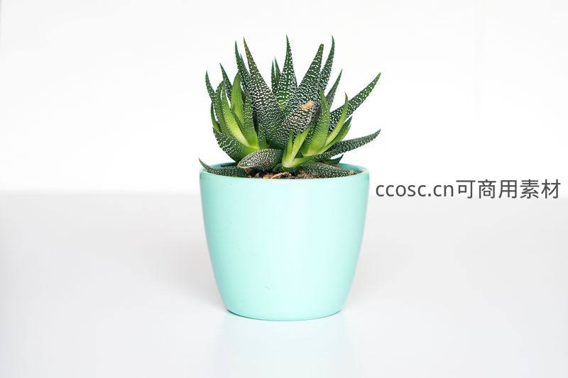 一株叶片上布满白色斑点的斑马芦荟,安静地生长在淡雅的浅蓝色花盆中,置于纯白背景前,显得格外清新脱俗,充满活力。