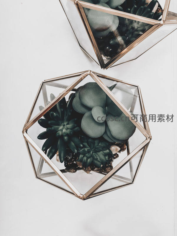 透明的多面体玻璃罩内,精心布置着几株深绿色的多肉植物,搭配金属质感的边框,构成一件兼具艺术感与现代气息的桌面装饰品。