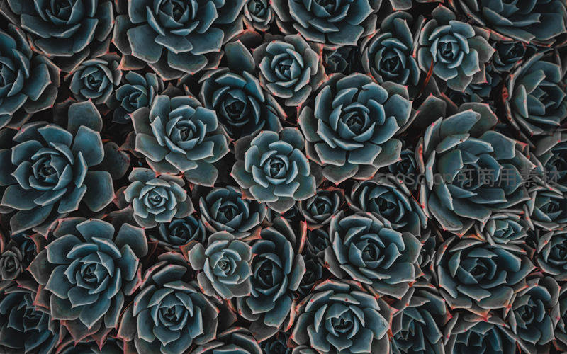 大量深蓝色调的多肉植物紧密相连,其层层叠叠的叶片形成了富有韵律感和视觉冲击力的抽象纹理背景,适合用作设计素材或壁纸。