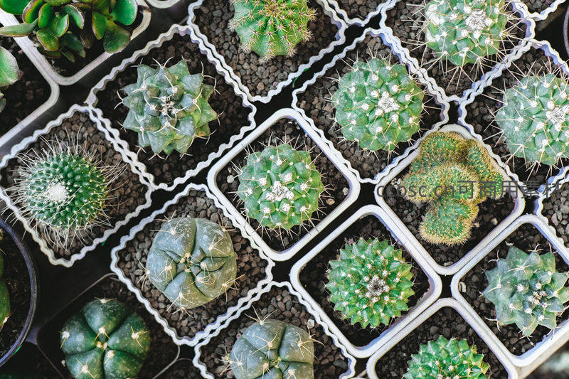 俯拍视角下,数十个白色塑料方格盆中整齐地种植着形态各异的仙人掌,它们或圆润或尖锐,在黑色土壤的衬托下,构成一幅充满秩序感的绿色画卷。