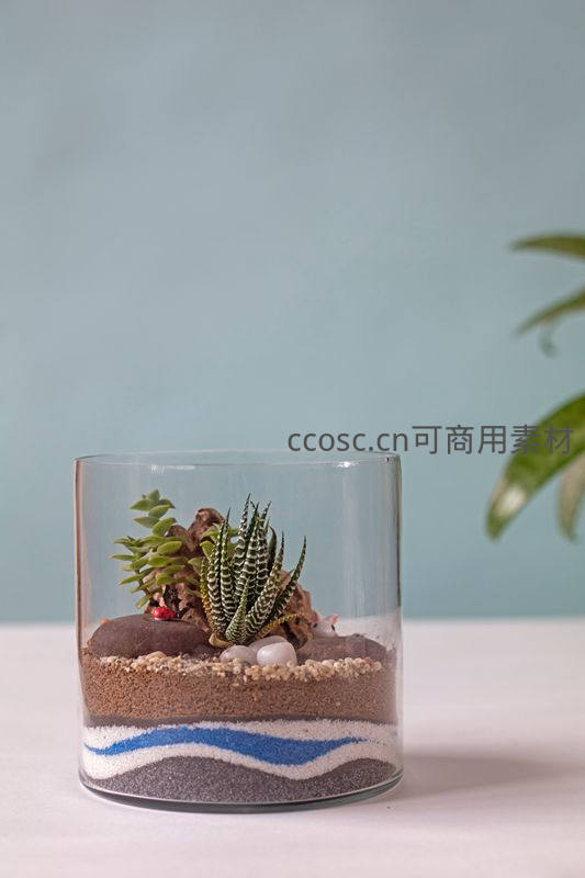 透明玻璃瓶内精心布置的微型沙漠景观,层叠彩沙与小巧多肉相映成趣,简约而富有设计感,是理想的桌面装饰品。