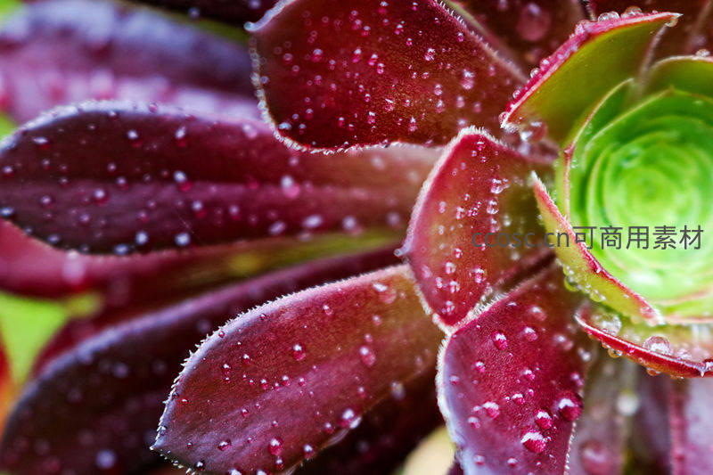 深红色的多肉叶片上布满了细小的水珠,在阳光下闪烁如宝石,中心嫩绿的新芽更显生命活力与自然的细腻之美。