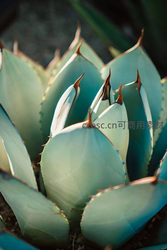 蓝绿色的龙舌兰叶片厚实挺拔,边缘的尖刺在光线下泛着金属光泽,展现出一种粗犷而坚韧的自然力量与几何美感。