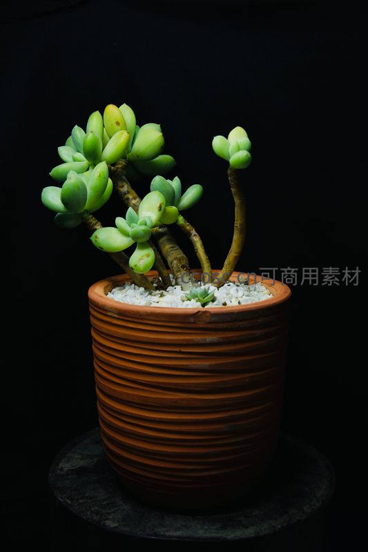 绿意盎然的多肉植于复古陶盆中,黑色背景强化视觉对比,光影交错间凸显植物的生命力与艺术感。