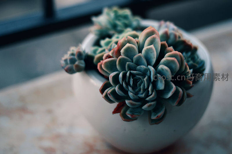 一株蓝绿色的多肉植物,叶片层层叠叠,置于简约的白色陶瓷盆中,背景虚化,营造出宁静舒适的家居氛围。