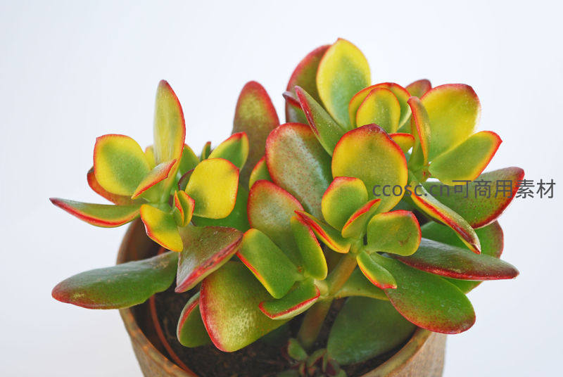 一盆叶片肥厚、边缘泛红的玉树多肉植物,色彩鲜艳夺目,置于陶土盆中,为室内空间增添一抹温暖而富有活力的绿意。