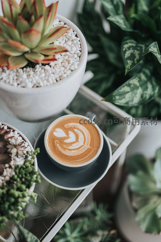 一杯精心制作的拉花咖啡置于玻璃托盘上,周围环绕着生机勃勃的多肉与观叶植物,营造出宁静舒适的居家或咖啡馆氛围。