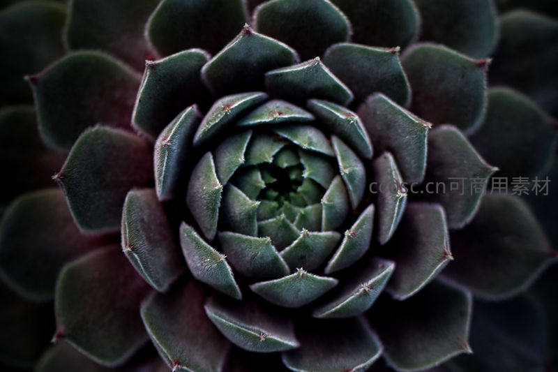 俯拍视角下,一株深绿色多肉植物的叶片紧密排列,形成一个深邃而对称的几何中心,边缘泛红,光影交错,尽显自然之神秘。