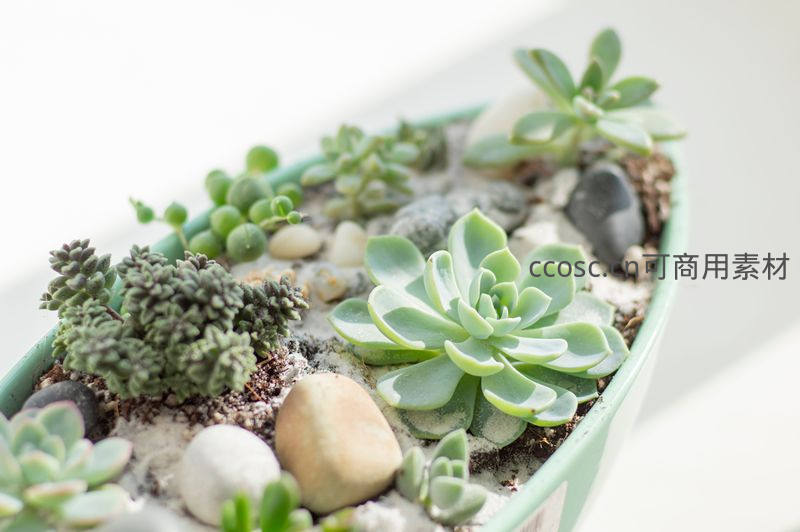一个长条形浅盆内精心布置了多种形态各异的多肉植物,搭配白色砂石与大小不一的鹅卵石,构成了一幅精致迷你的自然微缩景观。