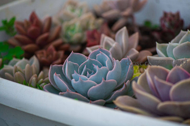 多种颜色的多肉植物紧密排列在白色花盆中,层层叠叠的叶片呈现出梦幻般的蓝紫与粉色调,微距镜头下尽显其精致纹理与宁静之美。
