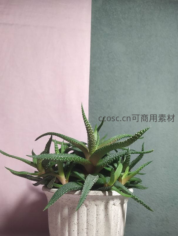 斑点芦荟在粉绿撞色墙前优雅绽放