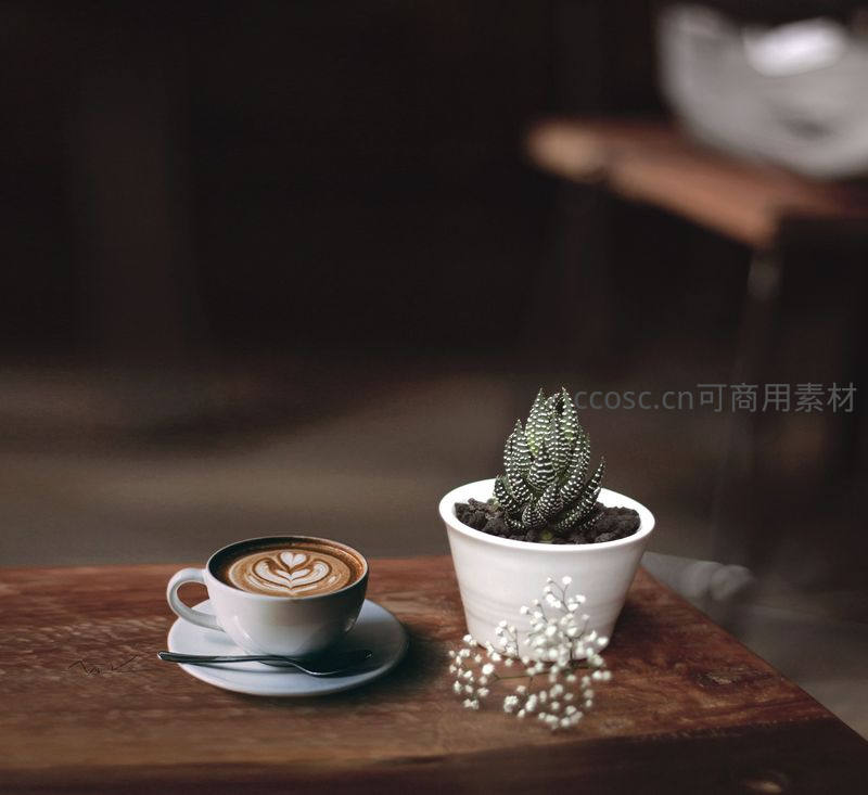 一杯带有精美拉花的咖啡与一盆小巧多肉并置在复古木桌上,旁有白色小花点缀,营造出宁静惬意的午后休闲氛围,享受慢生活。