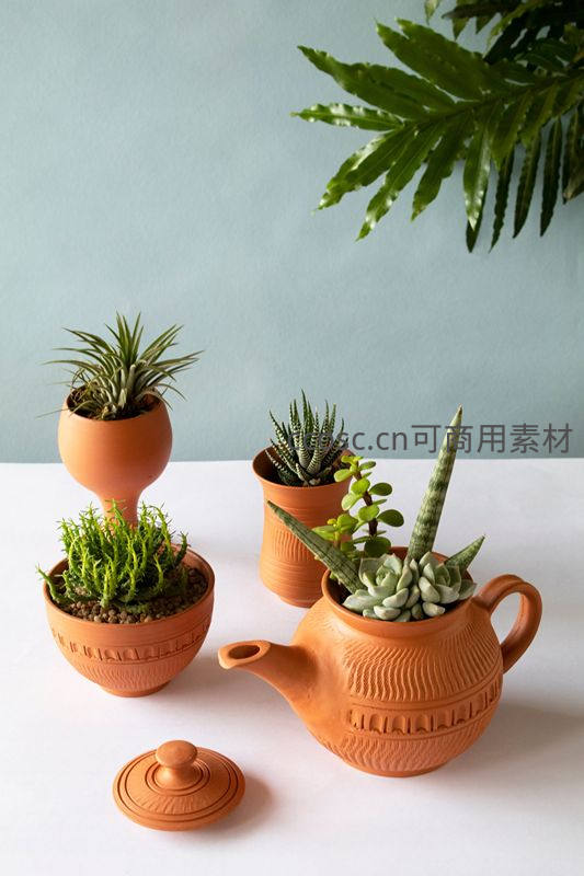 几株形态各异的多肉植物被巧妙种植在造型独特的陶土花盆中,包括茶壶和高脚杯形状,搭配清新墙面,营造温馨雅致的家居氛围。
