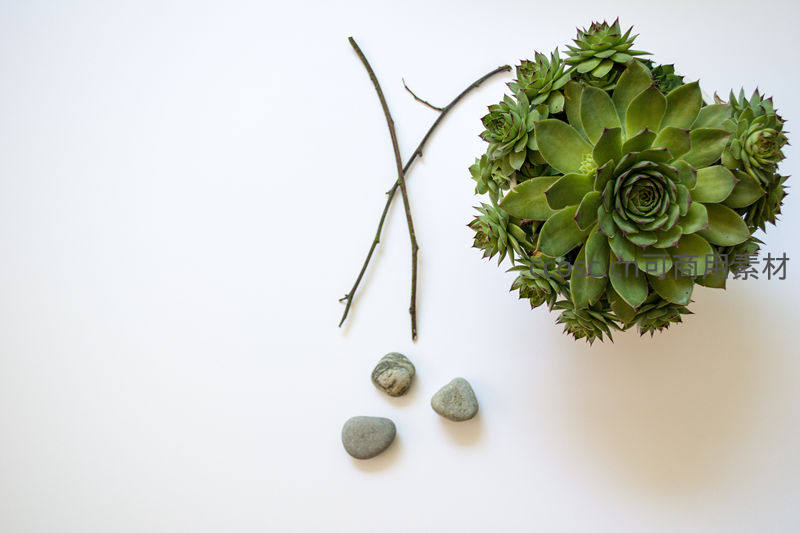 一株紧凑的多肉植物与几根枯枝、三颗小石子在纯白背景下形成极简构图,营造出宁静、素雅且富有禅意的视觉氛围。