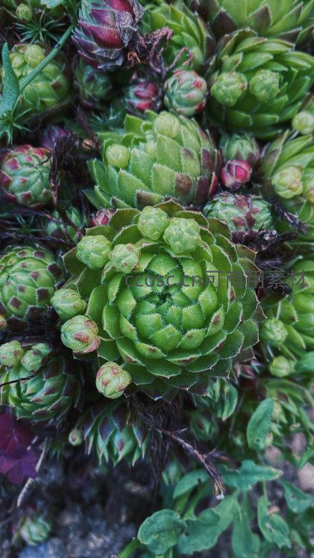 在野外环境中,一株饱满的绿色多肉植物舒展着螺旋状叶片,周围点缀着其他小型植物,散发出原始而蓬勃的自然气息。